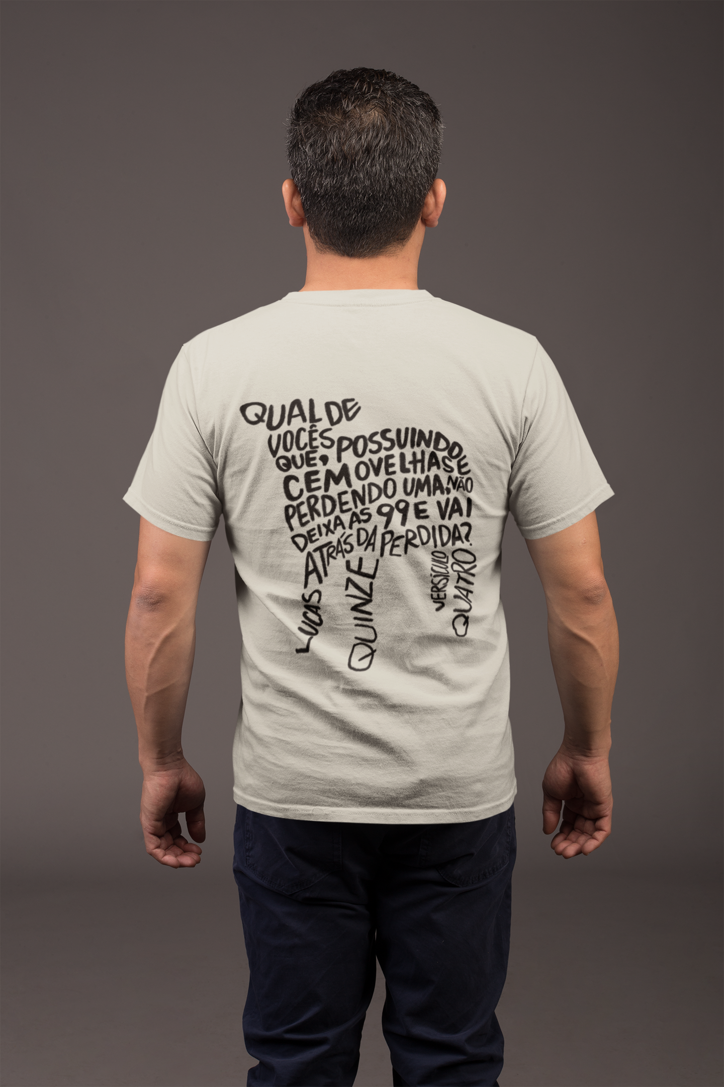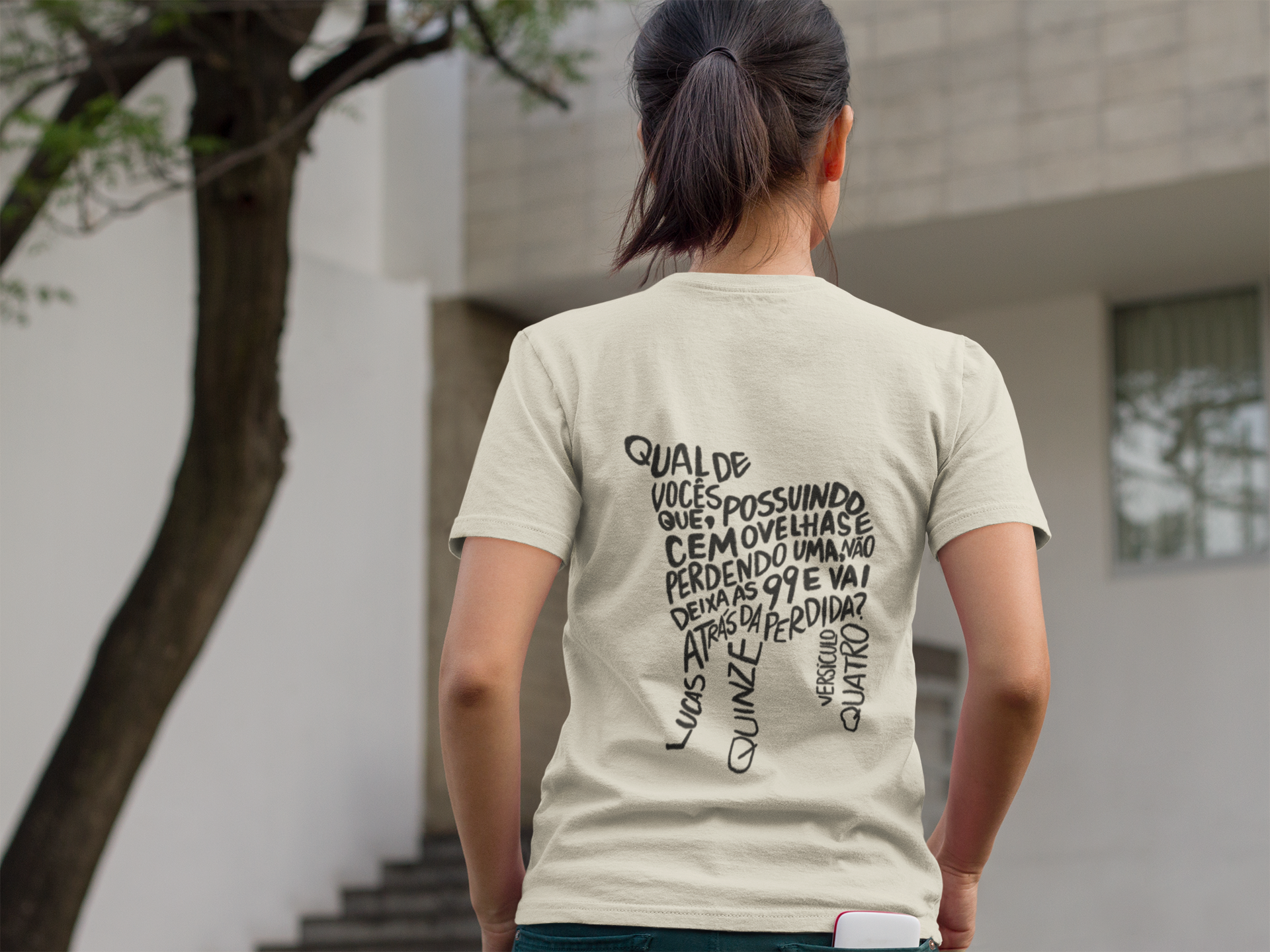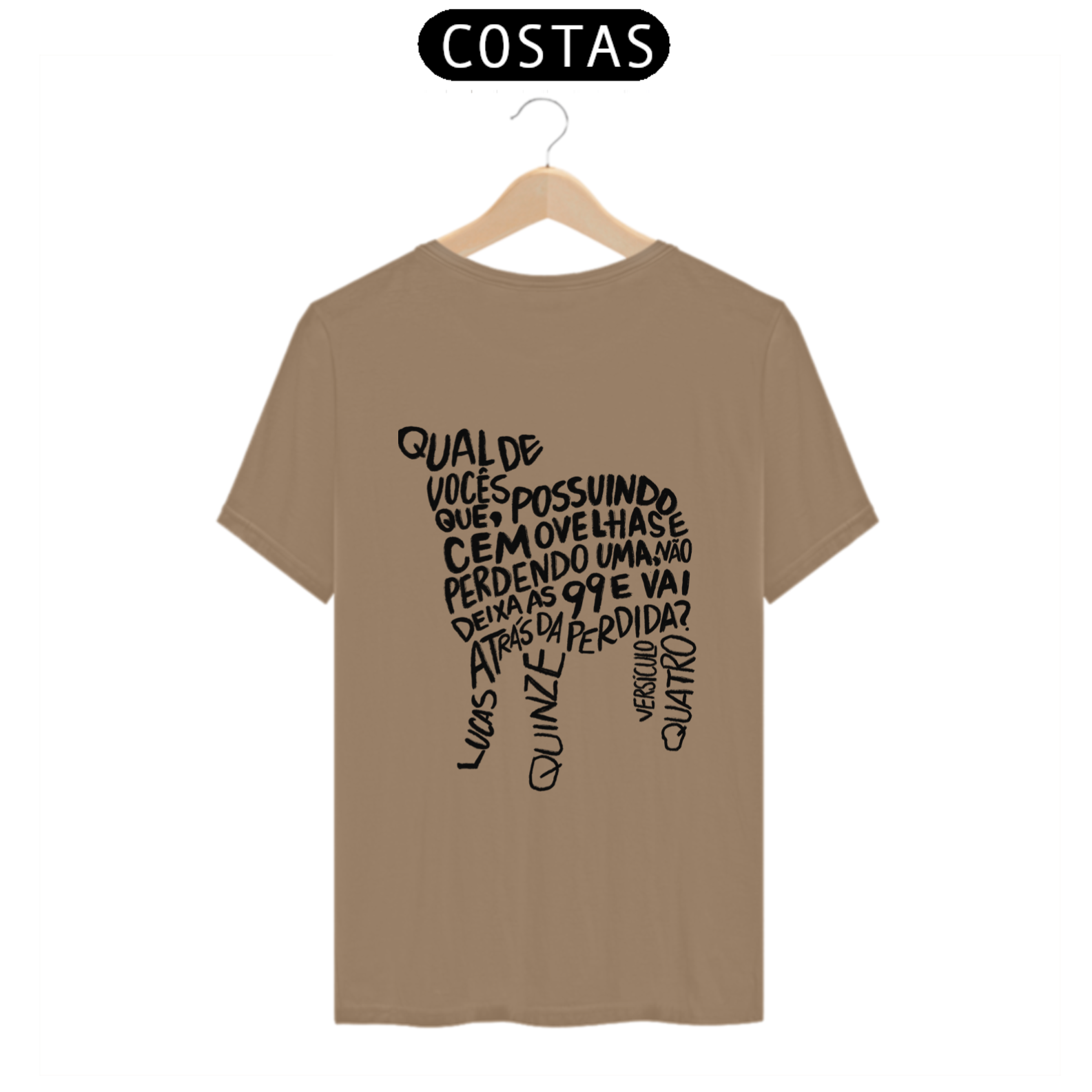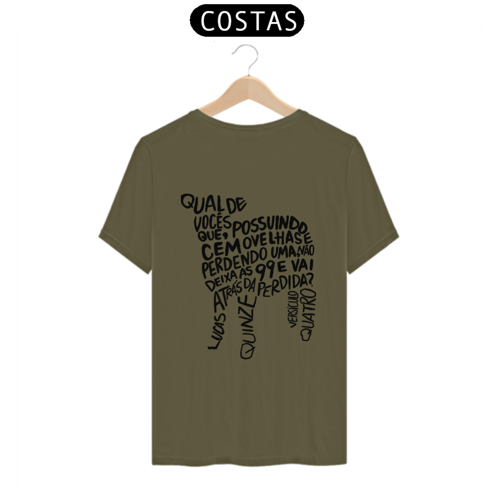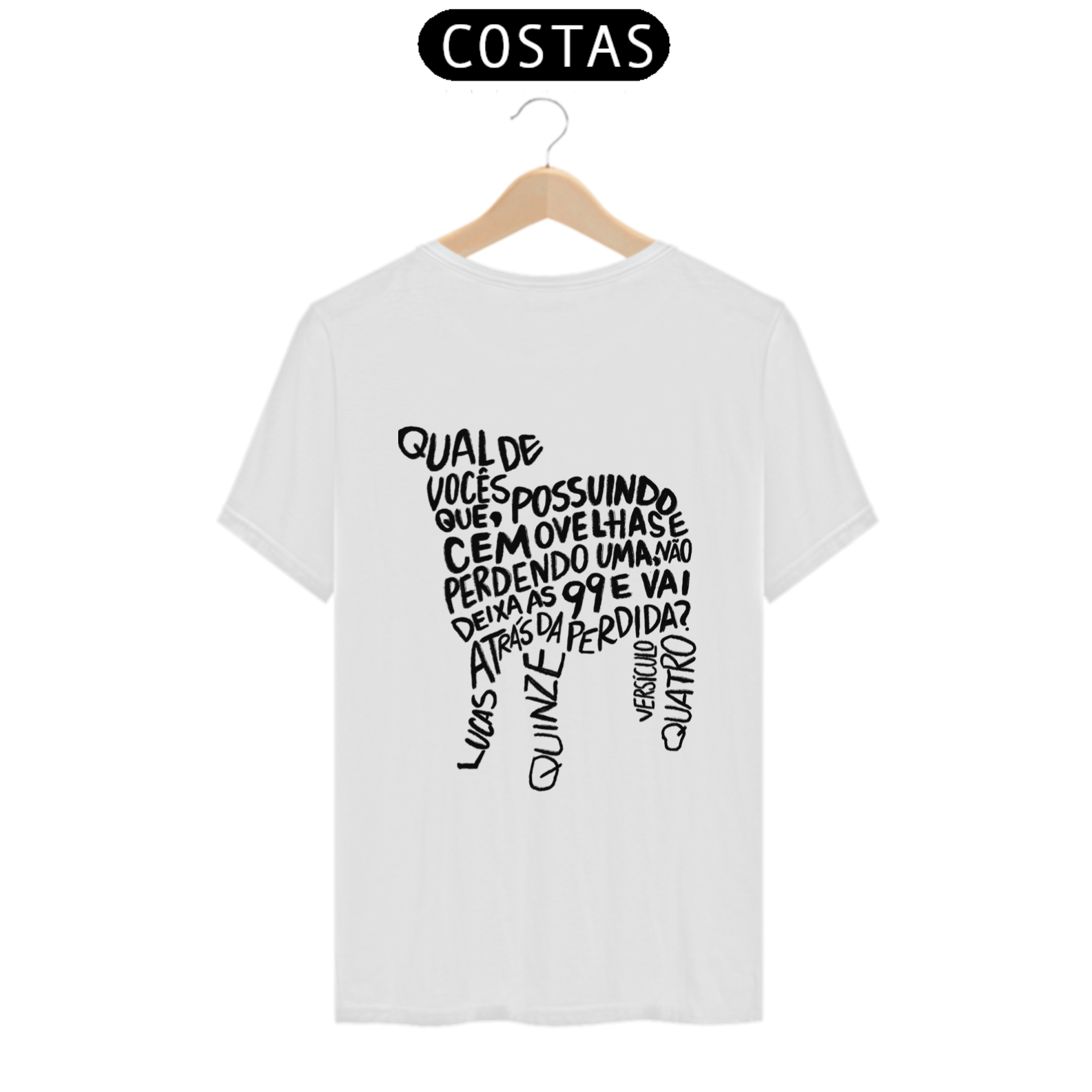 A camiseta “Lucas 15:4” carrega a mensagem transformadora da Parábola da Ovelha Perdida. A estampa, localizada na parte de trás da peça, traz o versículo