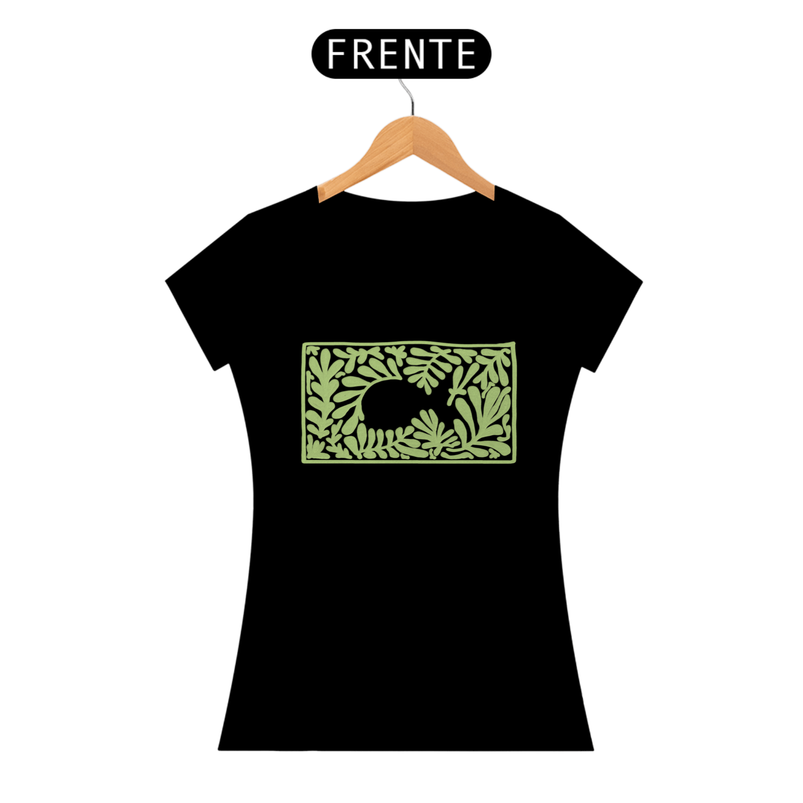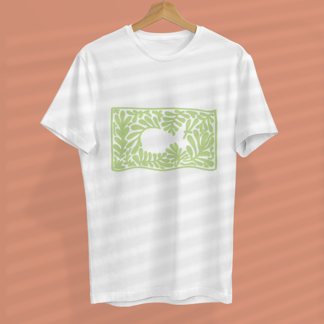 A camiseta “Peixe” traz um design sofisticado e minimalista, onde o contorno do Ichthys, o símbolo do cristianismo primitivo, surge de forma sutil entre elementos naturais.